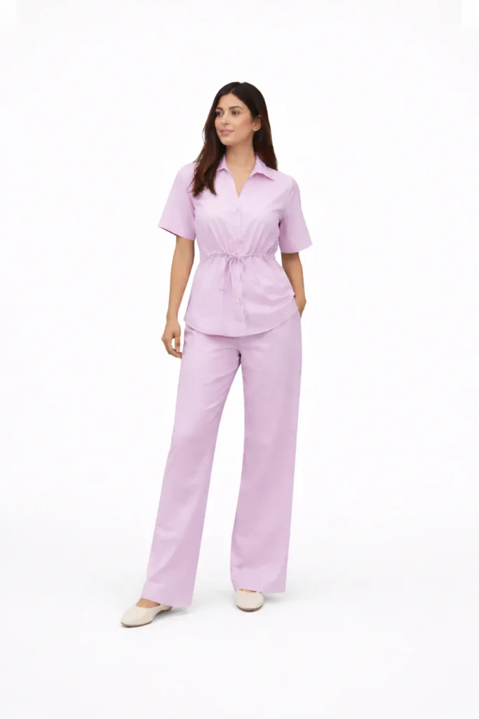 This lilac cotton coord set features a tailored shirt and straight-fit trousers designed for structured comfort.