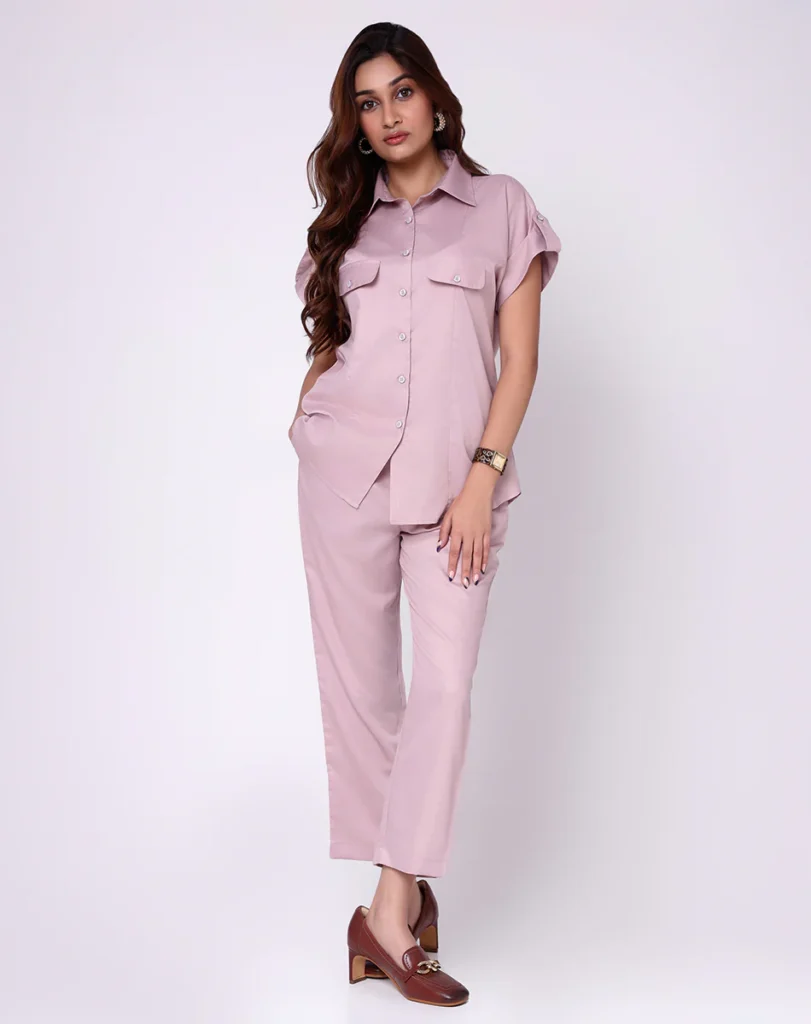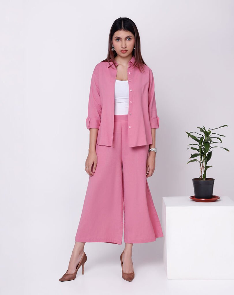 This onion pink coord set introduces warmth while preserving structure. The collared shirt and wide-leg trousers create a silhouette that feels fluid yet defined.