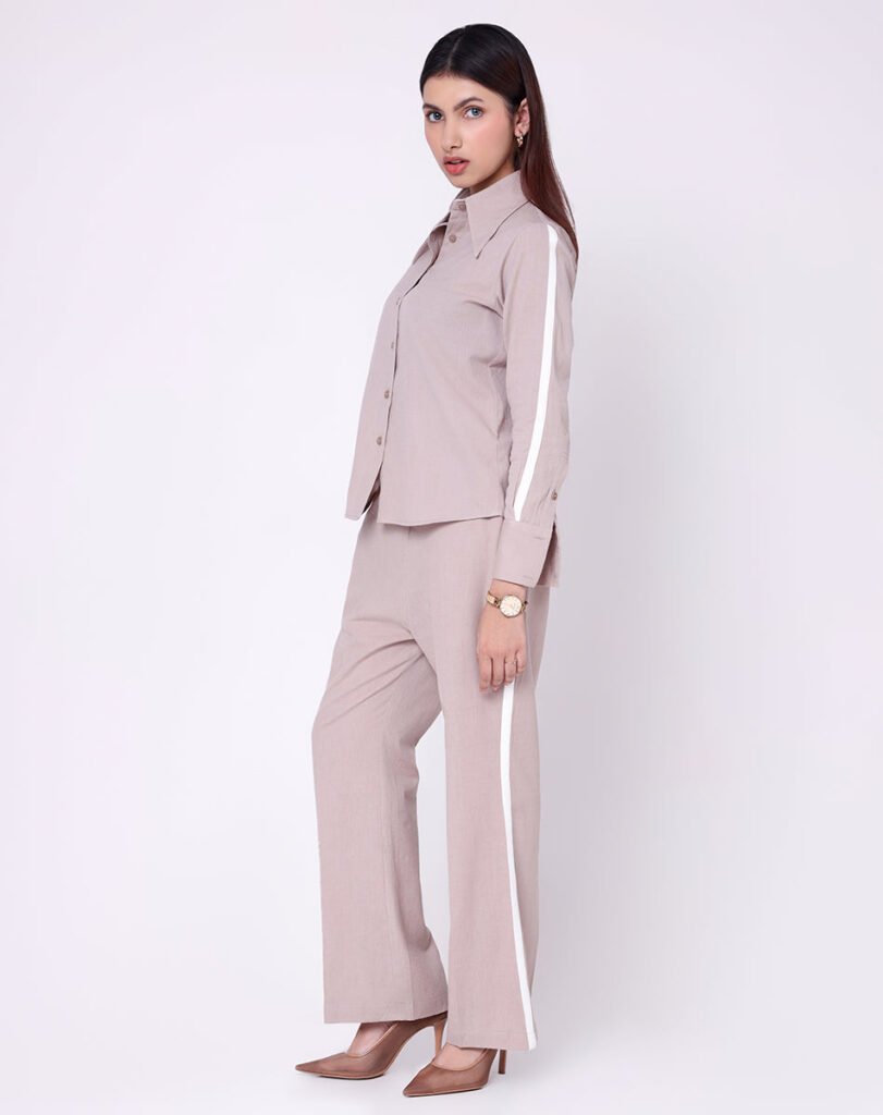 This striped beige cotton coord set for women embodies modern restraint. The tailored button-down shirt paired with straight-fit trousers creates a structured yet relaxed silhouette.